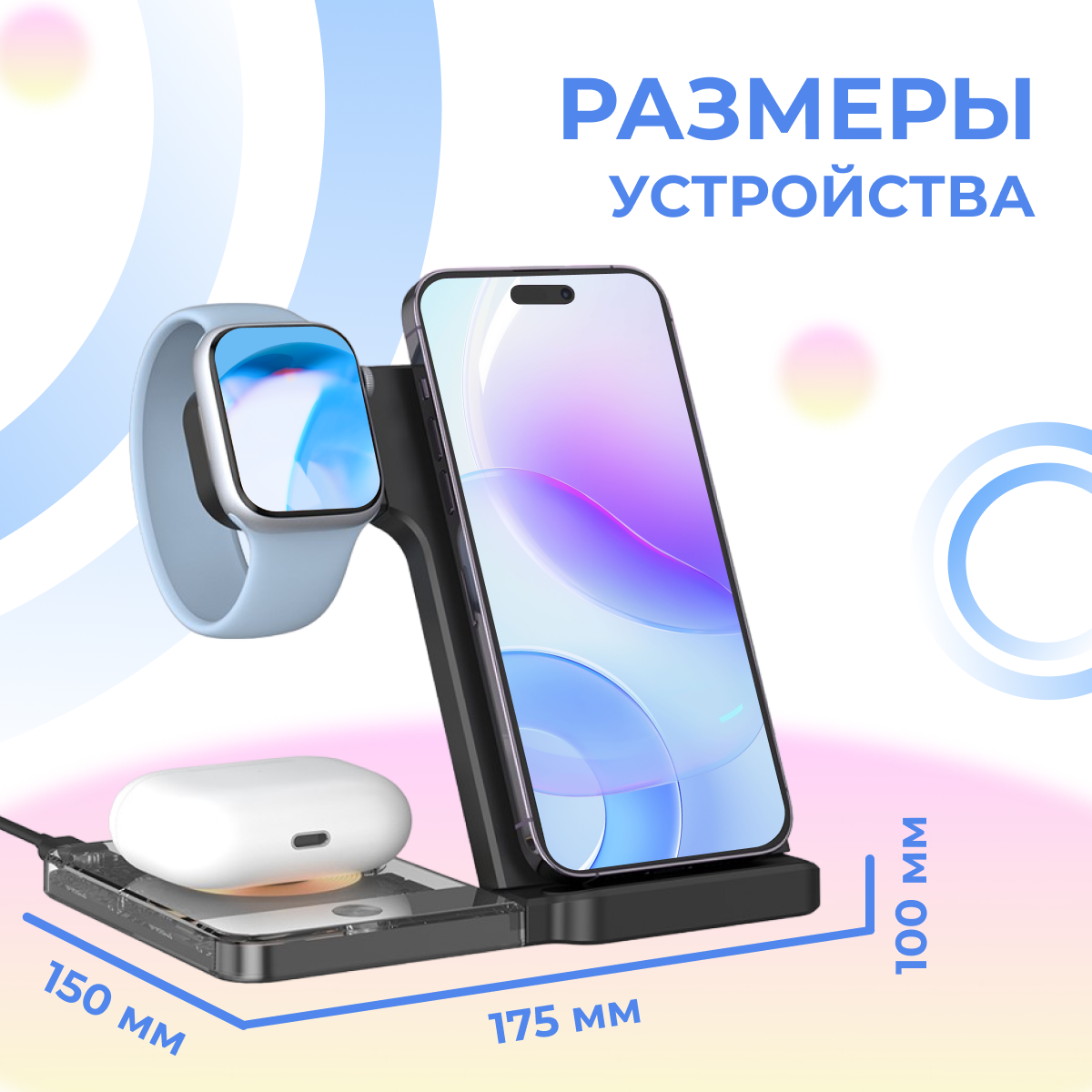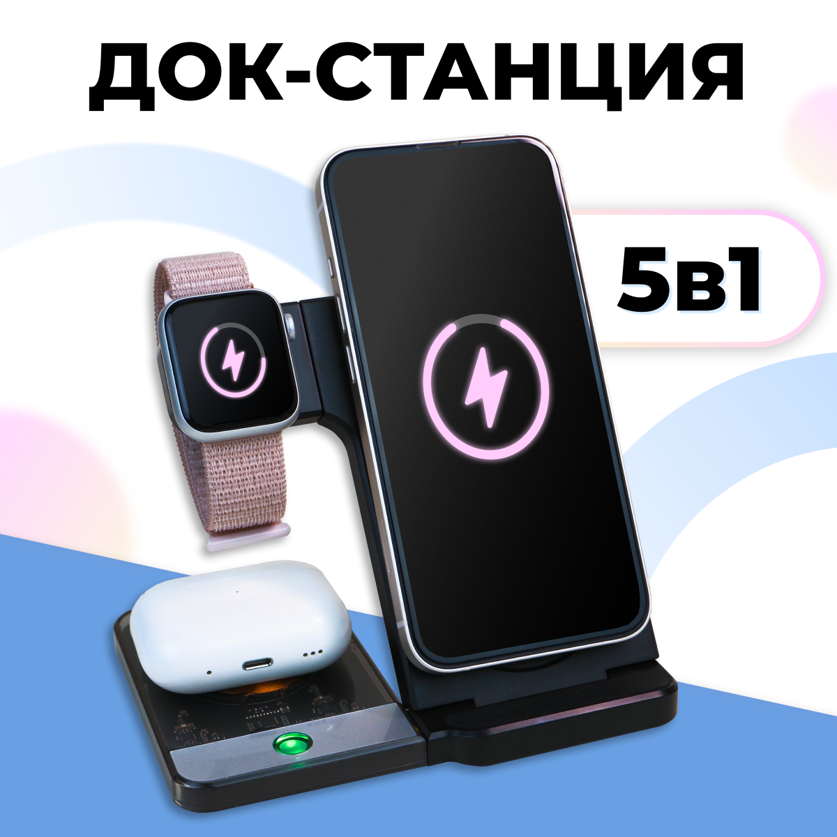 Беспроводная зарядка док станция 5 в 1 для iPhone, AirPods, Apple Watch, Android, черная информация: