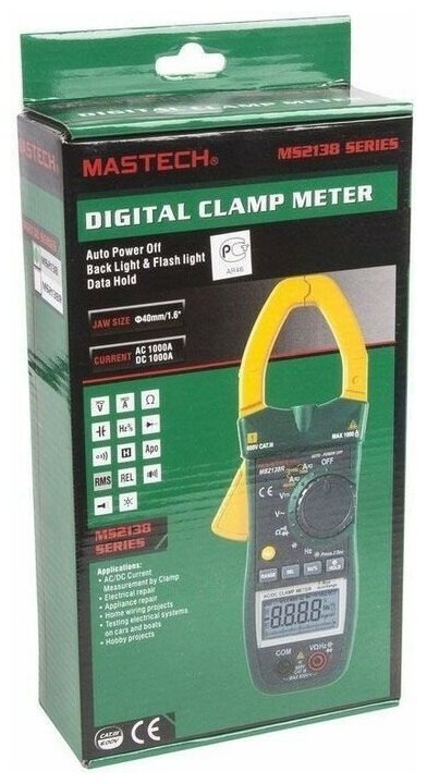 Цифровые токовые клещи MASTECH MS2138 с подсветкой рабочей зоны, охват 40 мм