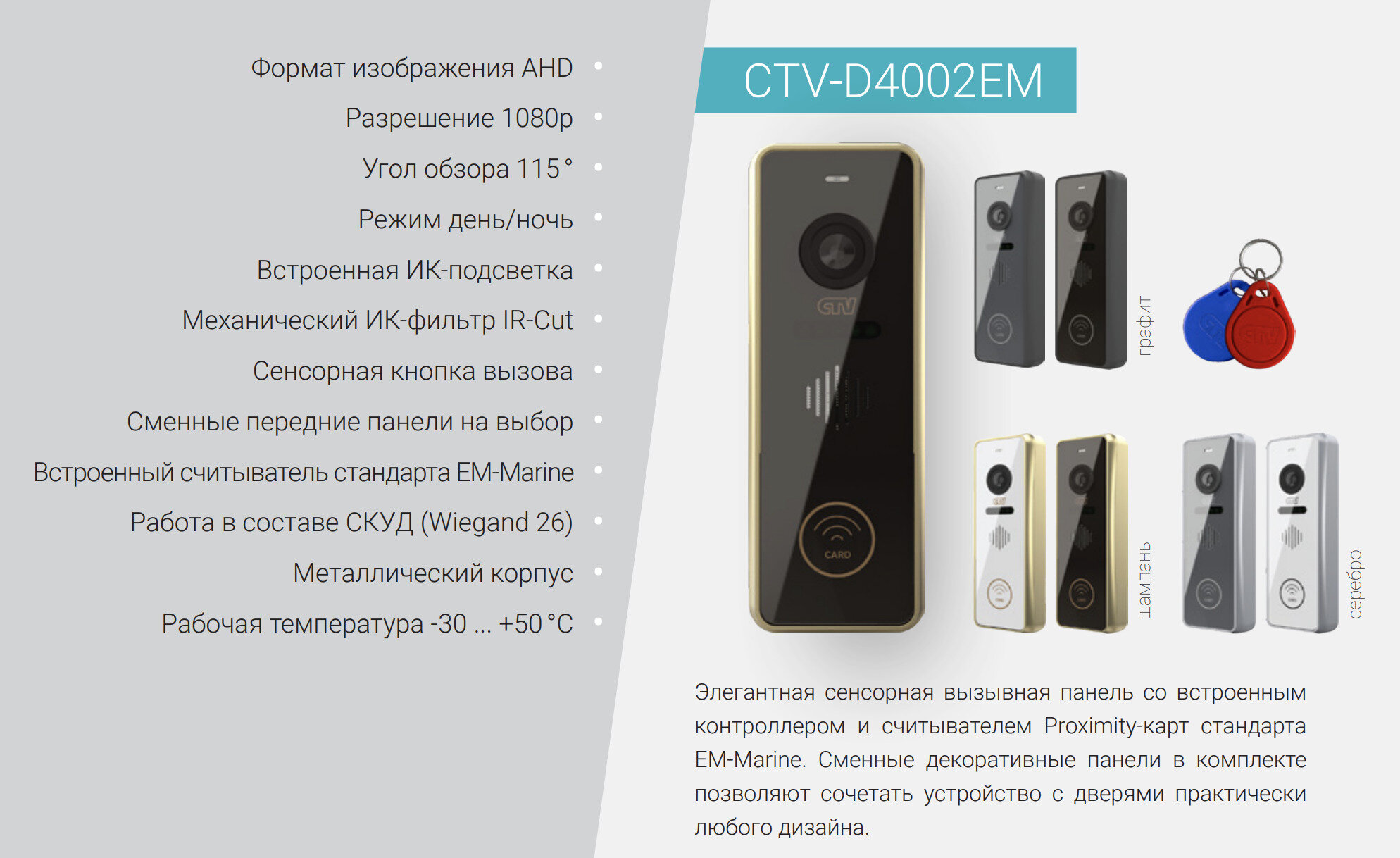 Отзывы на CTV-D4002EM (Серебро) Сенсорная вызывная панель видеодомофона, камера 2Mp FULL HD, 115 градусов, Встроенный контроллер-считыватель, ИК-подсветка, БУЗ в комплекте, Антивандальная, -30...+50С