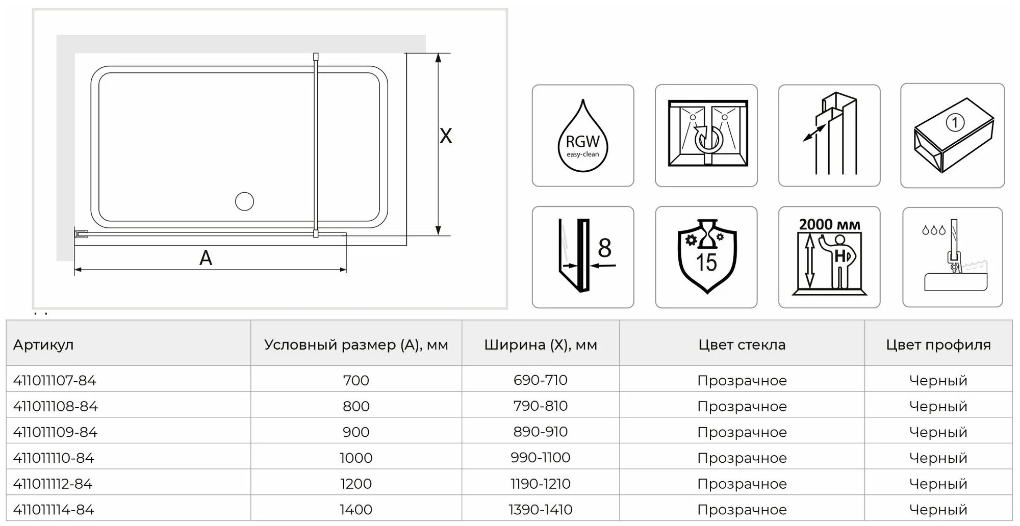 Перегородка для душа RGW WA-111B, 411011112-84, Чёрный, 120*195 19 786 ₽