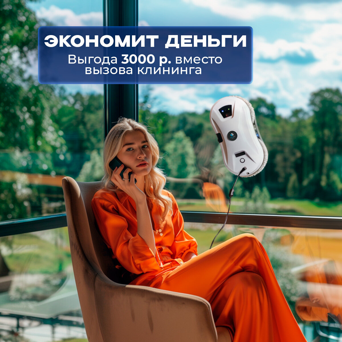 Робот-мойщик окон, с распылителем, страховочный шнур 4 м, пульт ДУ, 90 Вт, 10 сменных тряпок