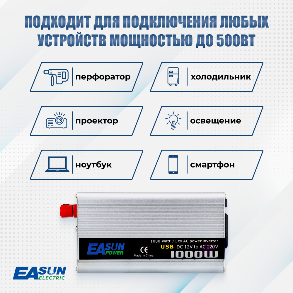 10 цен на Инвертор автомобильный 12 220В, 1000 Вт. Преобразователь напряжения. EASun Electric. К прикуривателю. Евророзетка и USB. Постоянная мощность до 500 Вт.
