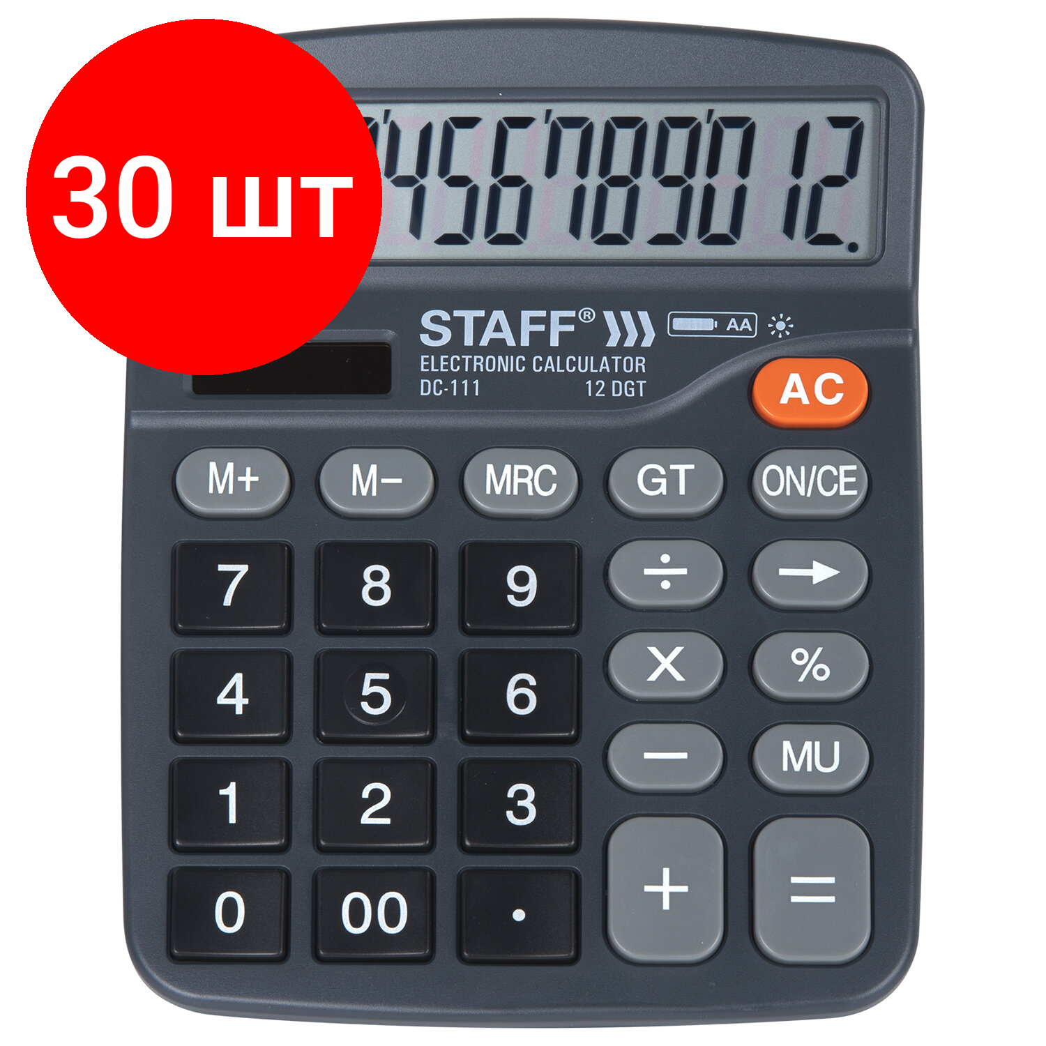 Комплект 30 шт, Калькулятор настольный STAFF PLUS DC-111 (180x145 мм), 12 разрядов, двойное питание, +батарейка АА, 250427 информация: