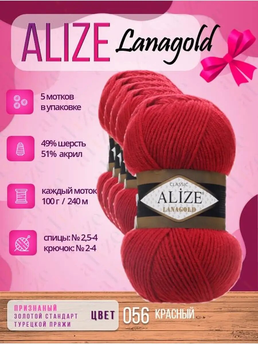 10 цен на Пряжа для вязания Alize Lanagold, цвет 56 красный, 100г, 240м, 5шт/упак