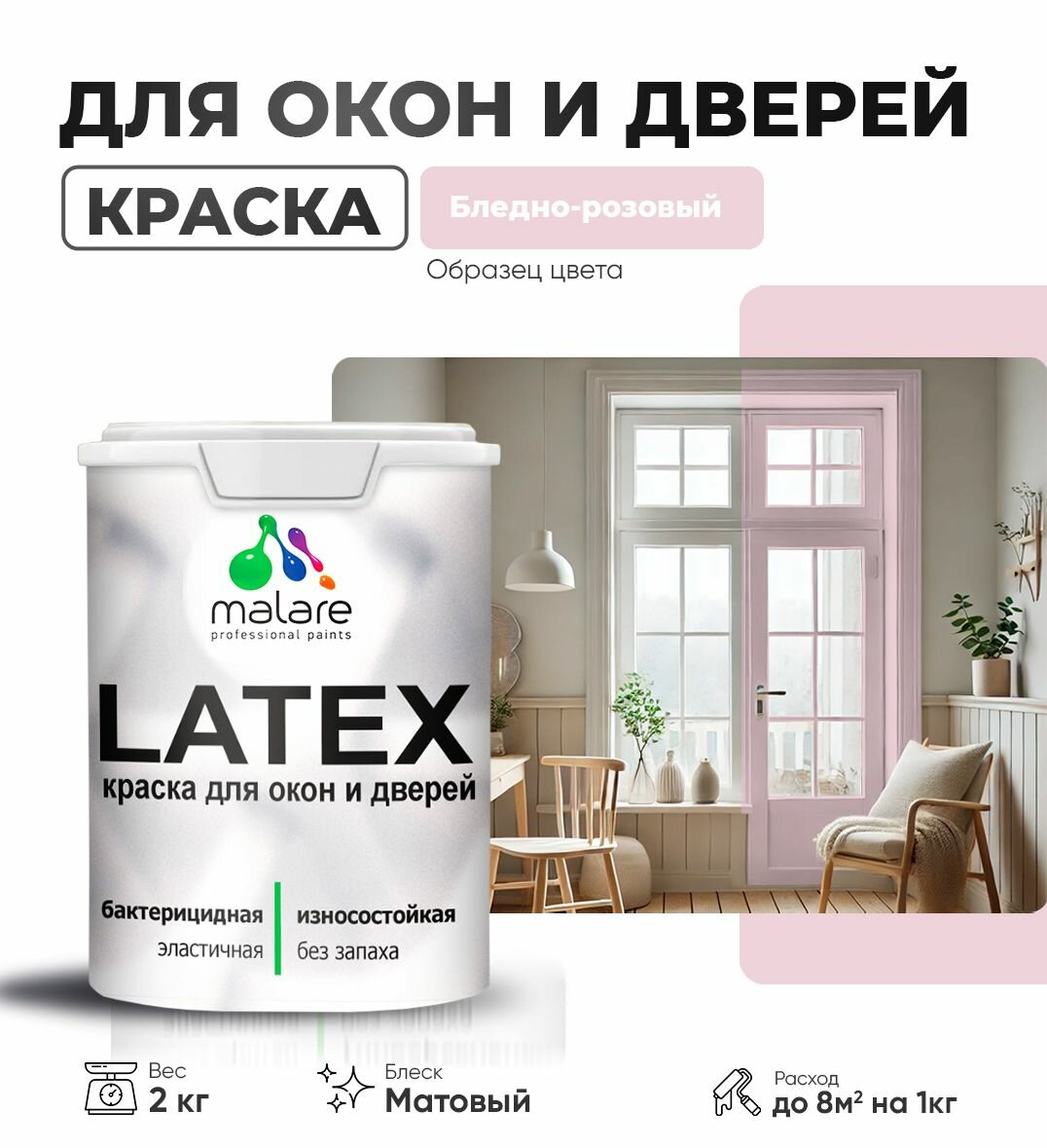 Акриловая краска для дверей и окон Malare Latex по дереву с антисептическим эффектом/ быстросохнущая моющаяся без запаха матовая, бледно-розовый, 2 кг. информация: