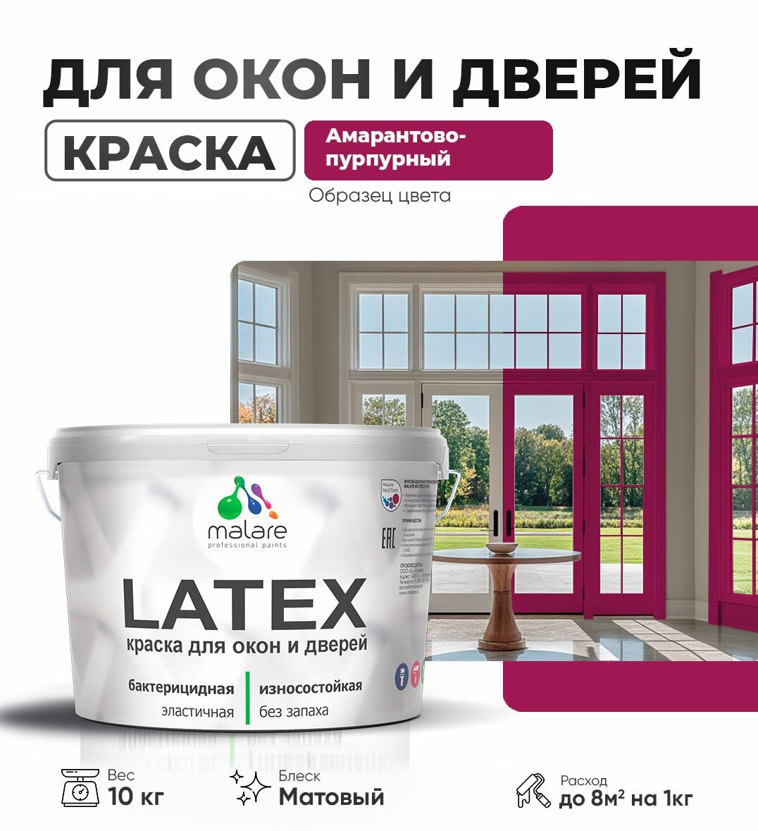 Акриловая краска для дверей и окон Malare Latex по дереву с антисептическим эффектом/ быстросохнущая моющаяся без запаха матовая, амарантово-пурпурный, 10 кг. информация: