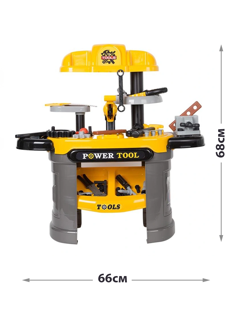 | Комплектация | стол, нижняя полка для хранения (32х22см), молоток, гаечный ключ, плоскогубцы (14х6см), пила (19х8см), ключ накидной, тиски, каска (диаметр 48см), разводной ключ, 2 отвертки, 3 шестеренки, 16 шурупов, 6 гвоздей, 8 гаек, 2 заготовки с отверстиями (19х5см), 2 насадки, наклейки |
