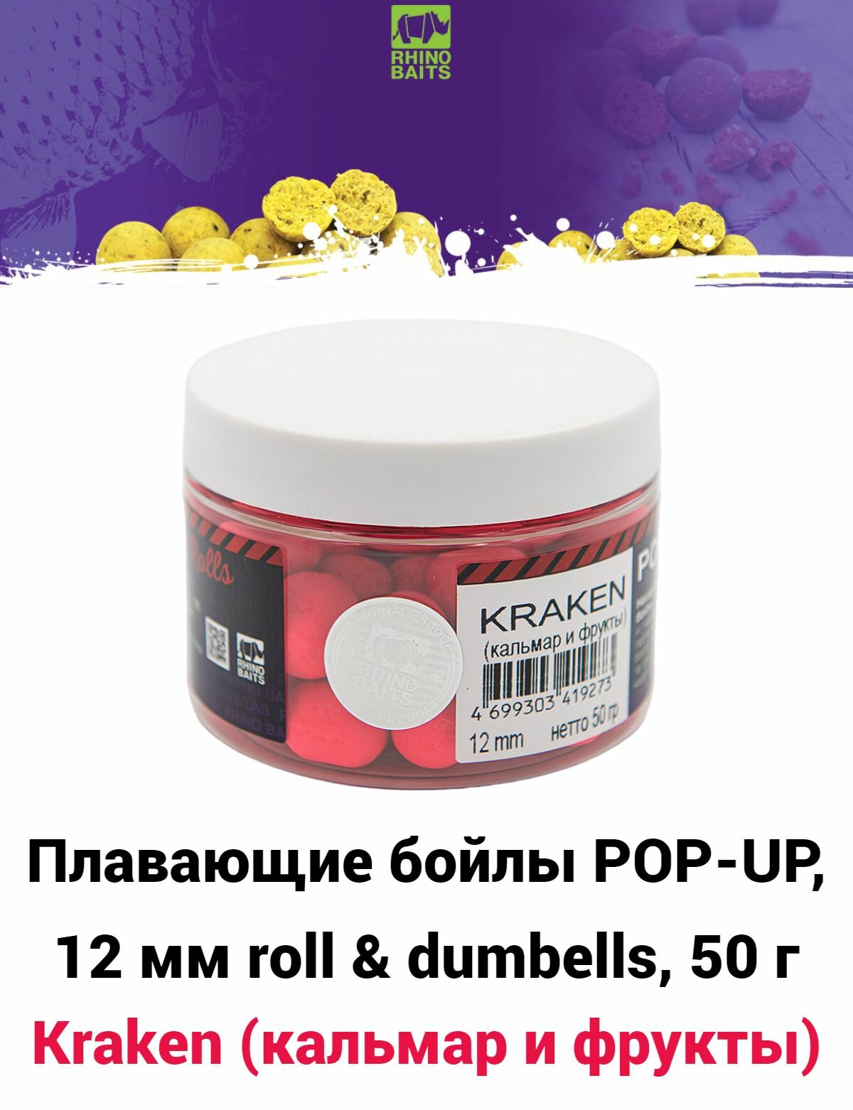 Плавающие бойлы Rhino Baits Pop-up, 12 mm, Kraken (кальмар и фрукты), 50 грамм, roll & dumbells, розовый флюро / плавающие насадочные / поп-ап информация: