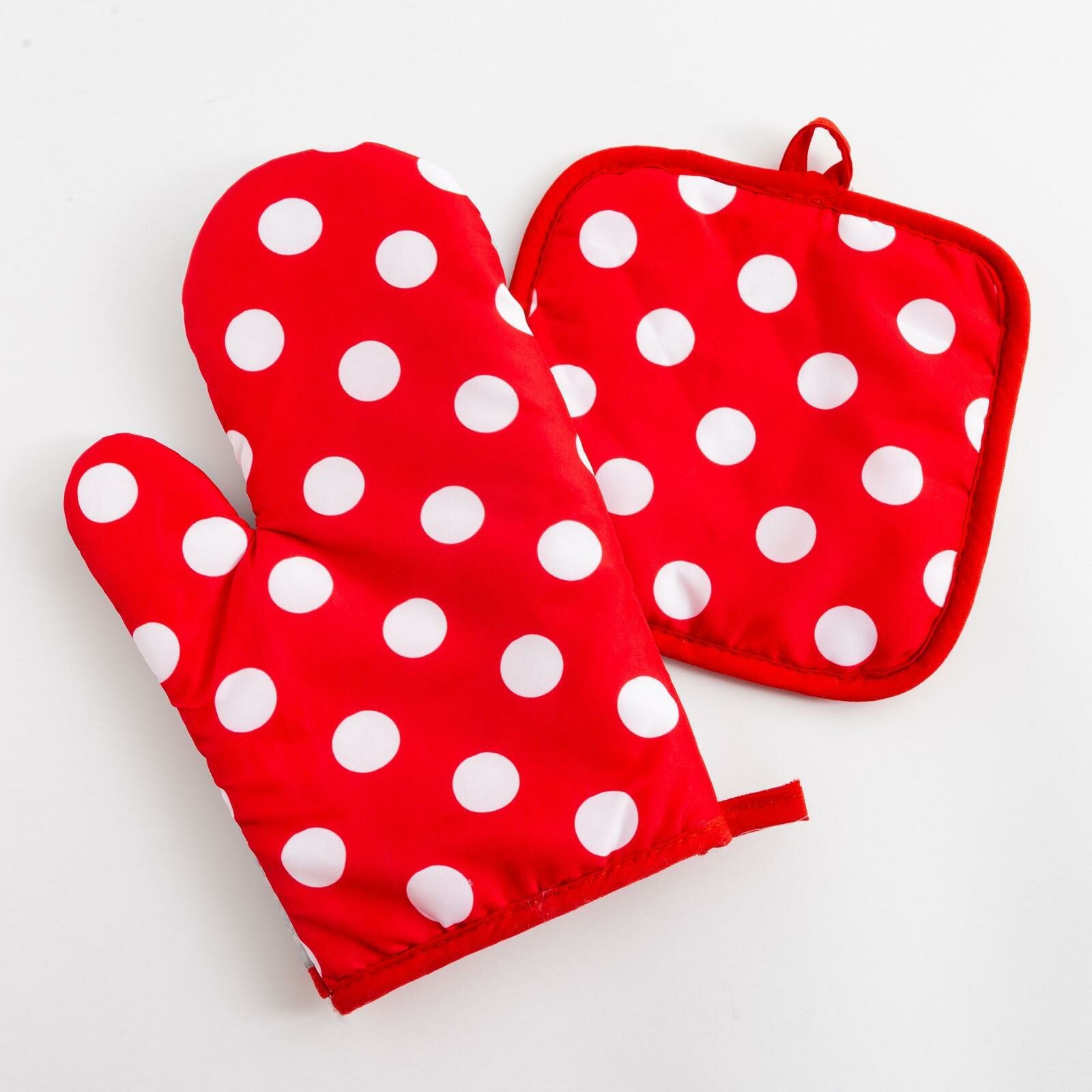 Кухонный набор (2 предмета) Доляна «Горох», цвет красный, прихватка 17х17 см, рукавичка 26х16 см, 100% п/э, цвет белый, материал полиэстер