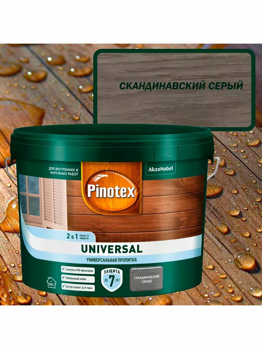 Универсальная пропитка на водной основе 2в1 для древесины Pinotex Universal полуматовая (9л) скандинавский серый информация: