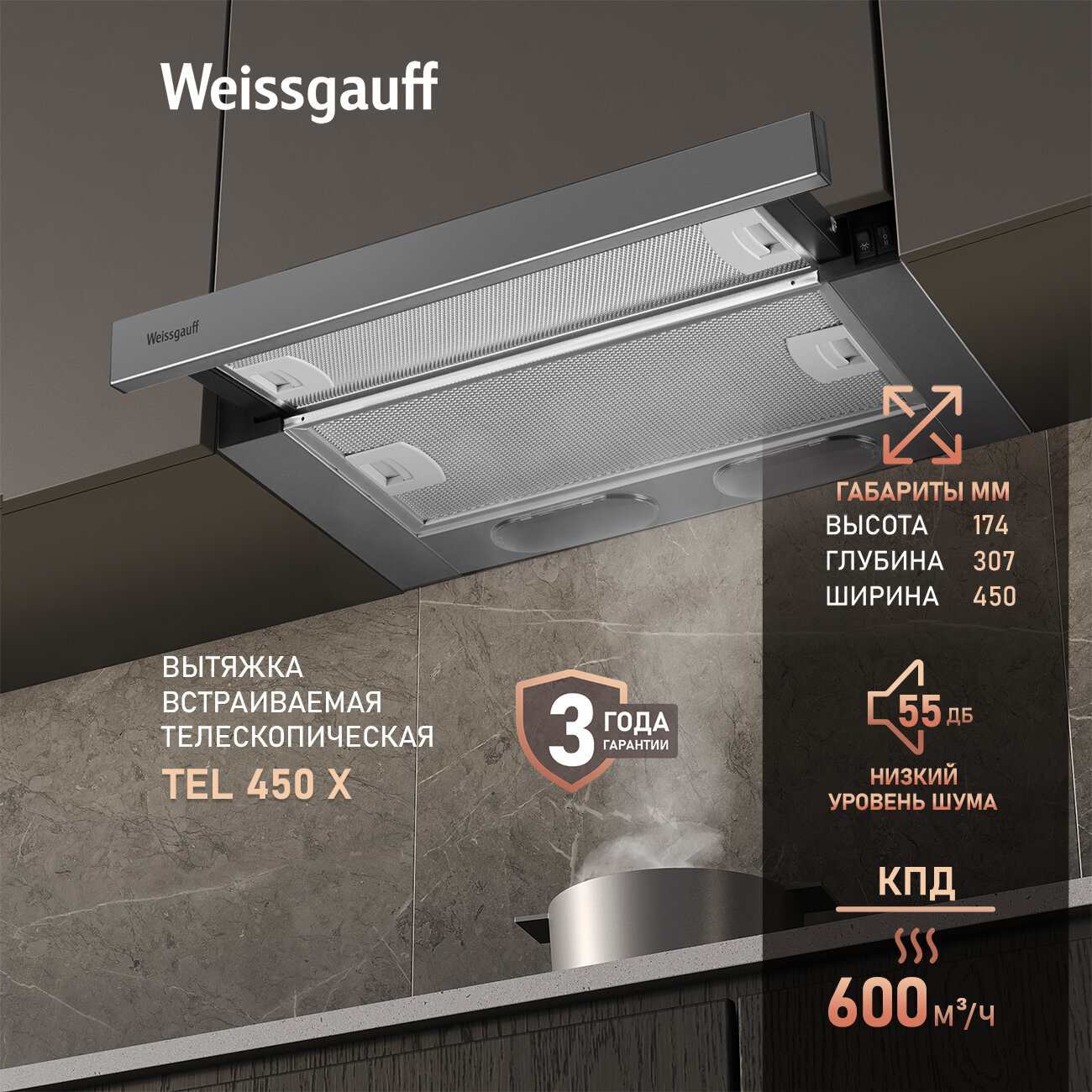 Встраиваемая вытяжка WEISSGAUFF TEL 450 X, управление кнопочное, нержавеющая сталь [430022] 9 618 ₽