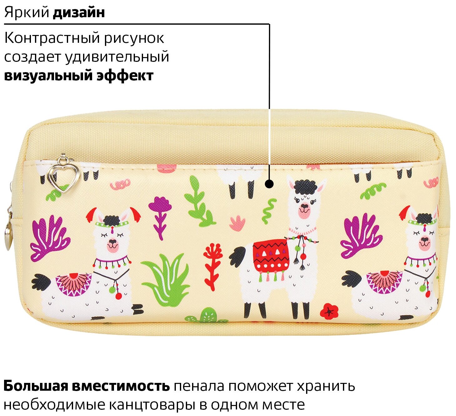 Пенал Юнландия, 2 отделения, мягкий, полиэстер, Ламы, бежевый, 20х6х9 см, 228981 информация: