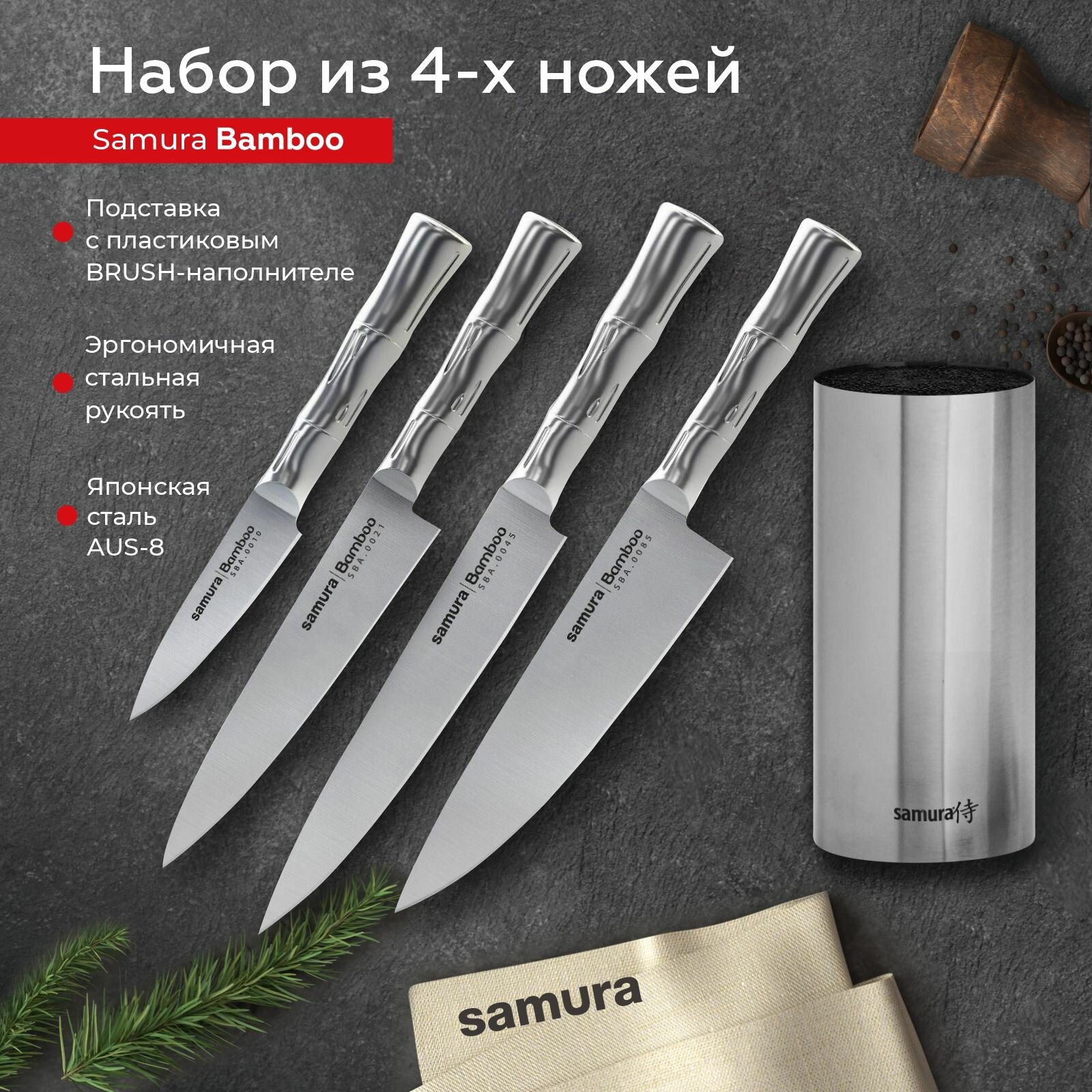 Набор кухонных ножей с подставкой Samura Bamboo / овощной нож / универсальный нож / слайсер / шеф нож / SBA-05 информация: