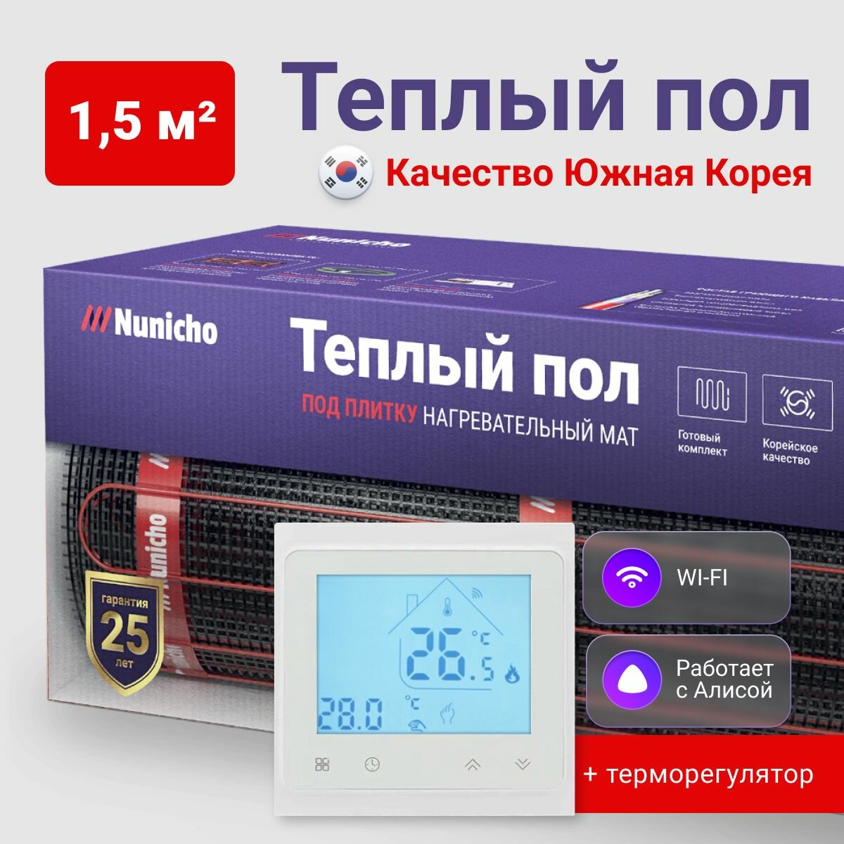 Теплый пол электрический под плитку 1,5 м2 Nunicho 150 Вт/м2 с Wifi терморегулятором белым, нагревательный мат пр-во Южная Корея информация: