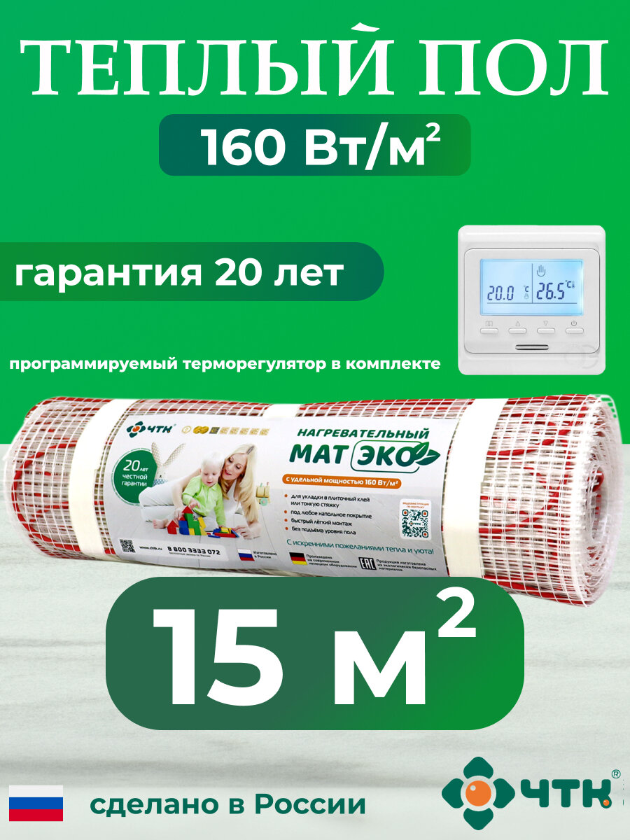 Теплый пол электрический ЧТК 15,0 м2 160 Вт/м2 нагревательный мат ЭКО с программируемым белым терморегулятором в комплекте информация: