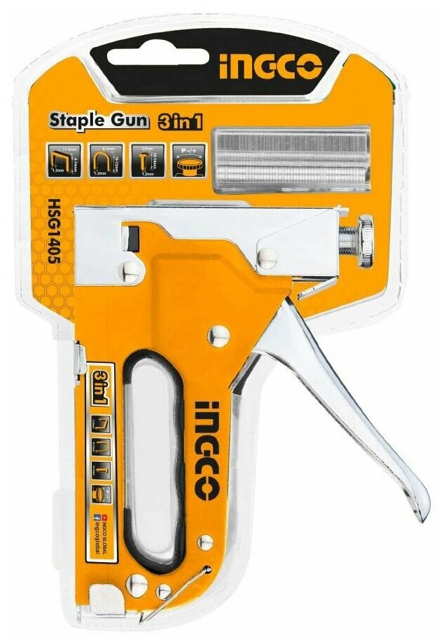 Пистолет скобозабивной металлический 3 в 1, скобы в комплекте, Ingco HSG1405