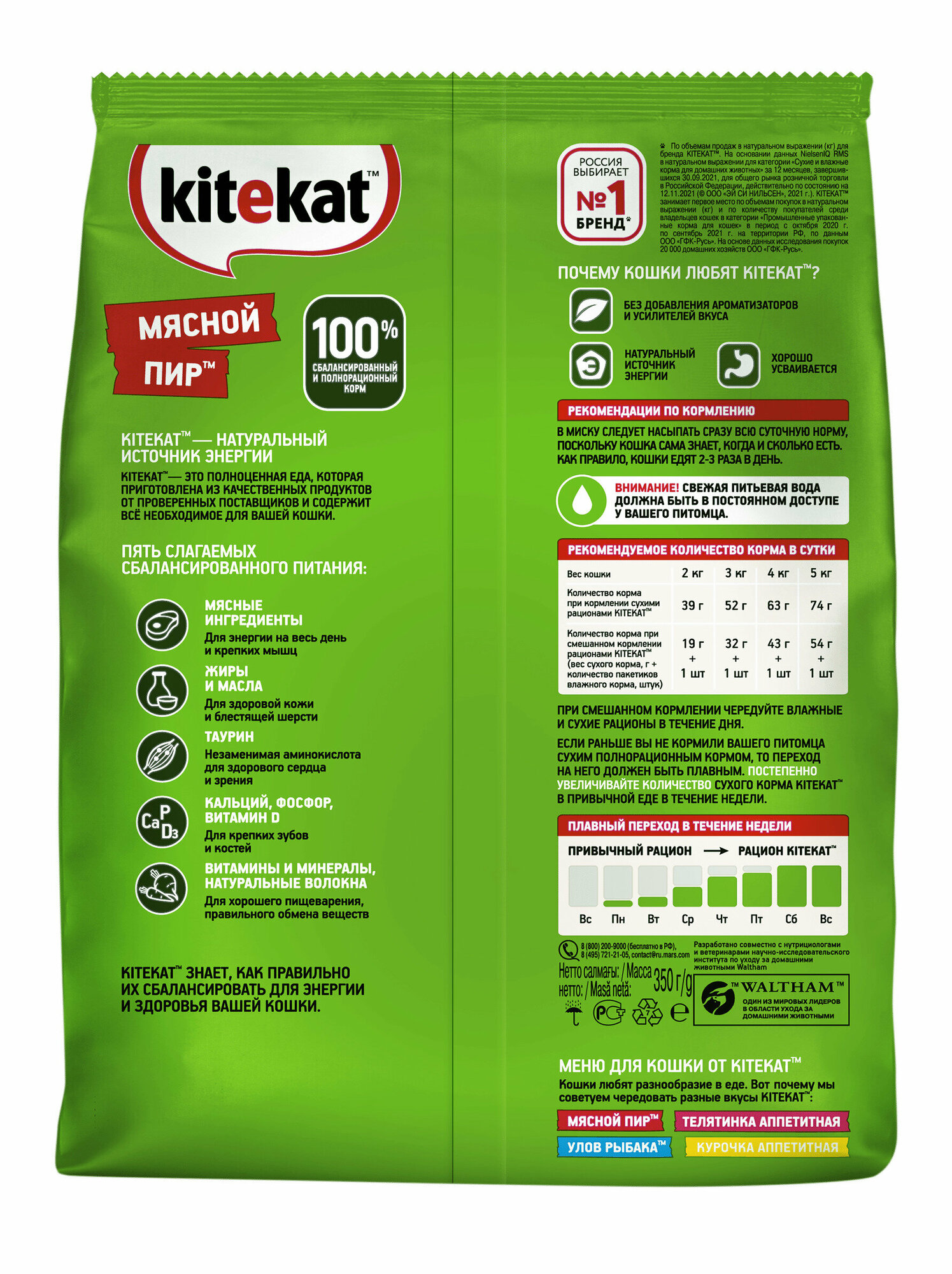 Сухой полнорационный корм KITEKAT для взрослых кошек «Мясной Пир», 20 шт по 350 г информация: