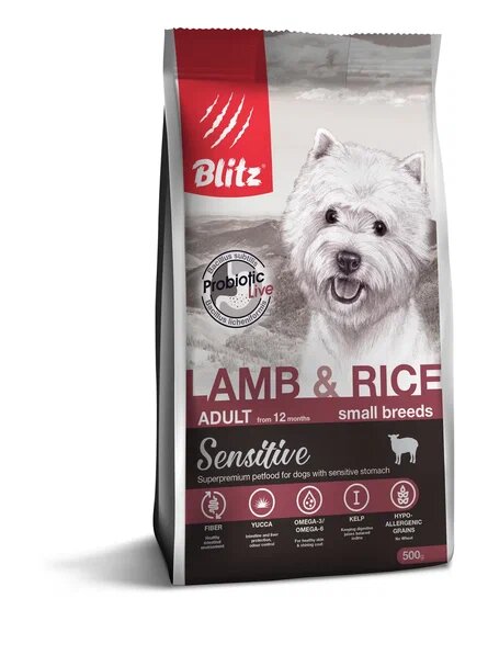 Сухой корм Blitz для собак мелких пород с чувствительным пищеварением ягненок и рис sensitive lamb & rice adult dog small breeds 500г 680627
