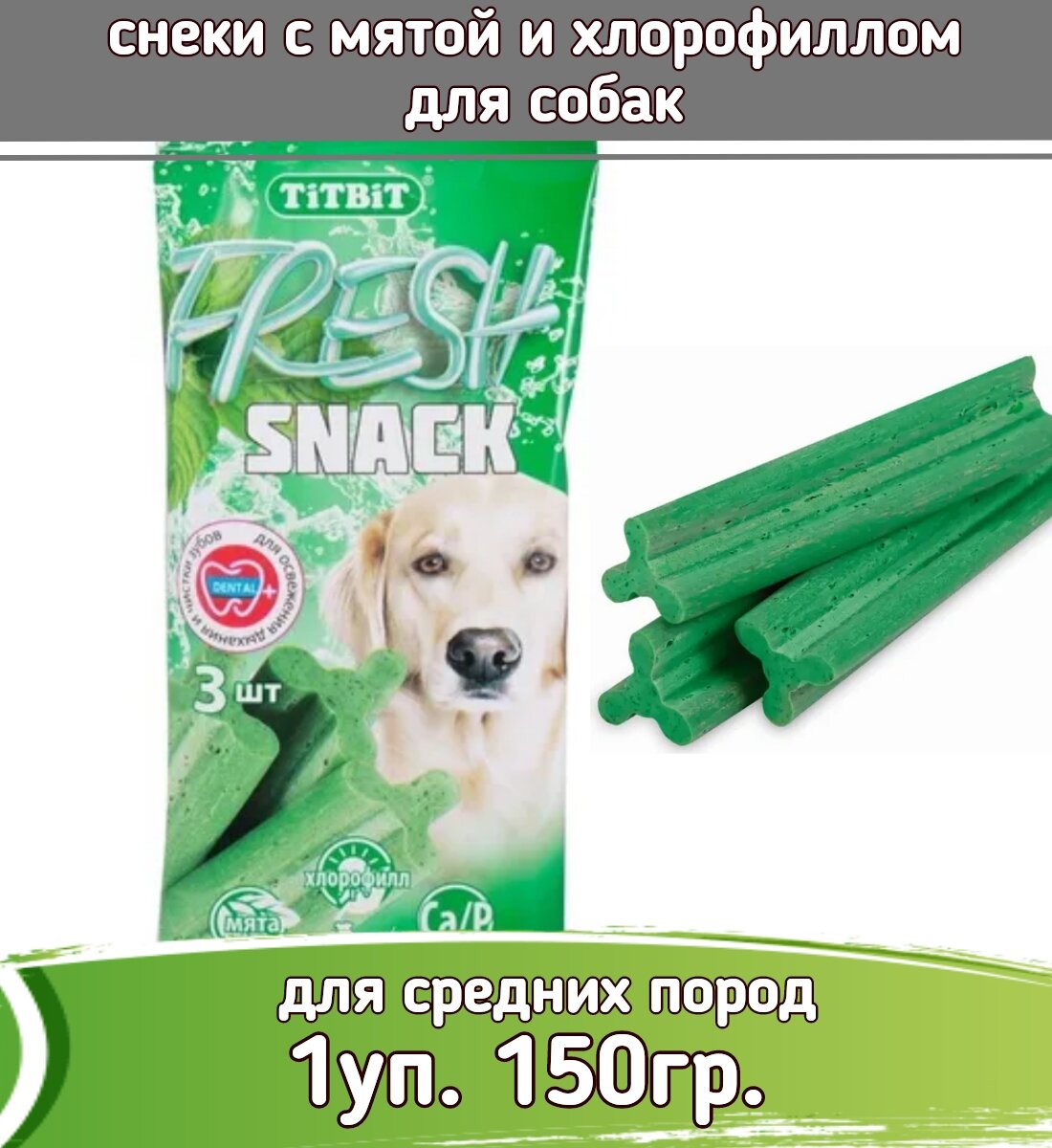 TiTBiT Fresh 1шт - 150г лакомство снеки с мятой и хлорофиллом для собак средних пород