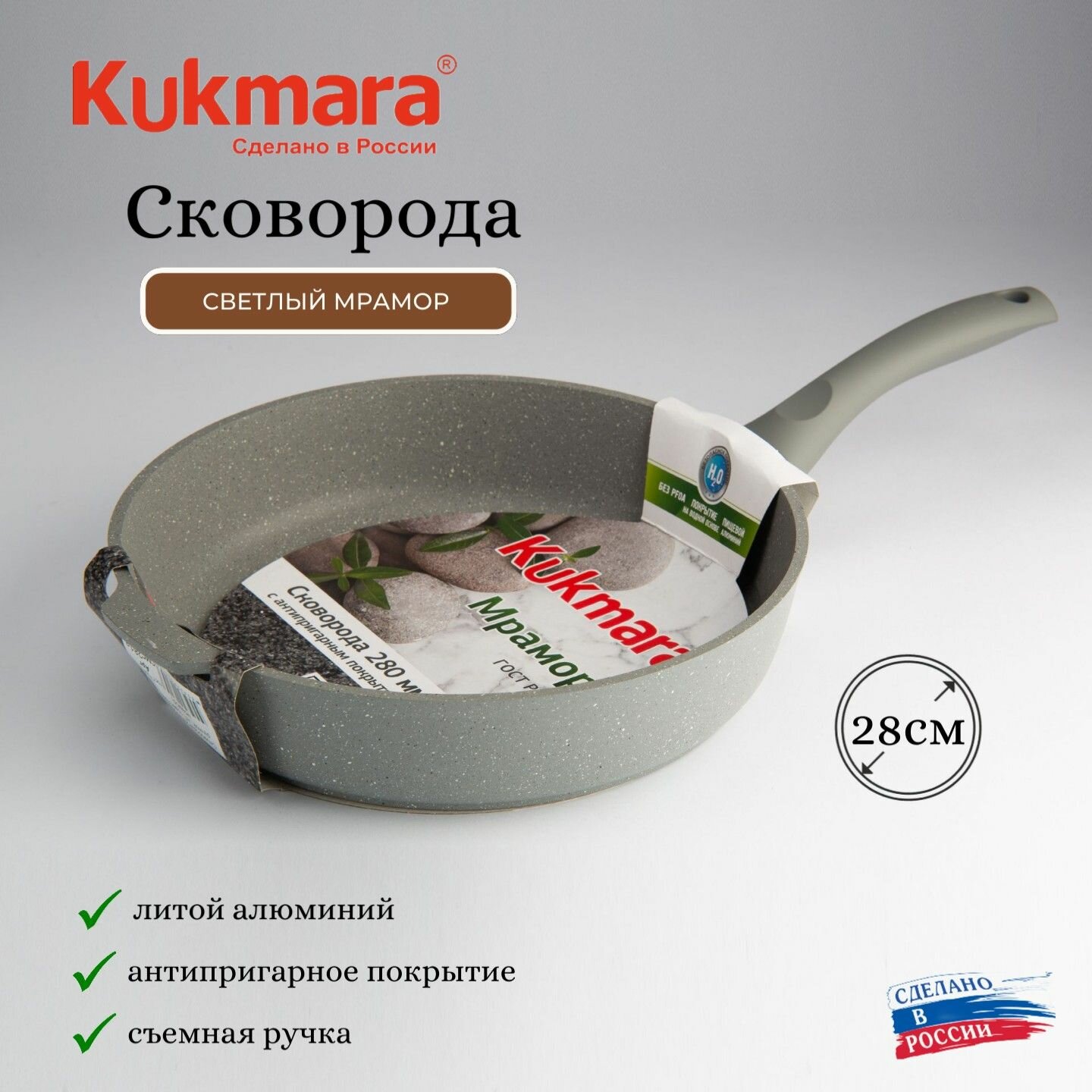 KUKMARA Сковорода, d28 см, съёмная ручка, антипригарное покрытие, светлый мрамор