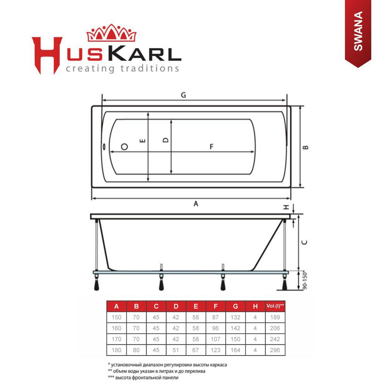 Акриловая ванна HusKarl SWANA 170х70, комплект 2 в 1: ванна, усиленный каркас. Из 100% литьевого акрила. информация: