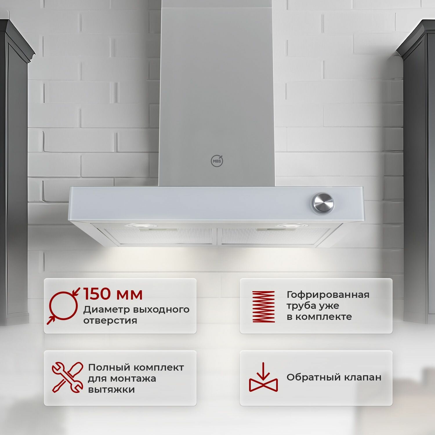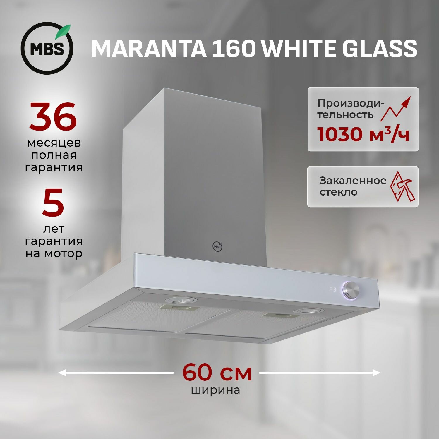 Кухонная вытяжка MBS MARANTA 160 WHITE GLASS/60 см/производительность 1030м3/ч, низкий уровень шума. информация: