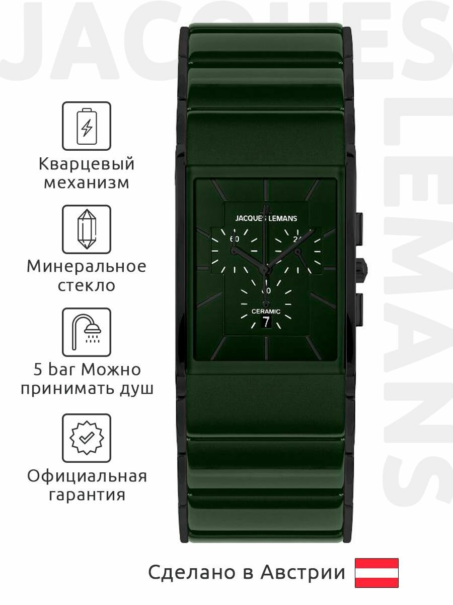 Наручные часы Jacques Lemans 1-1941G, прямоугольные керамические с хронографом и датой на комбинированном браслете (сталь и керамика)
