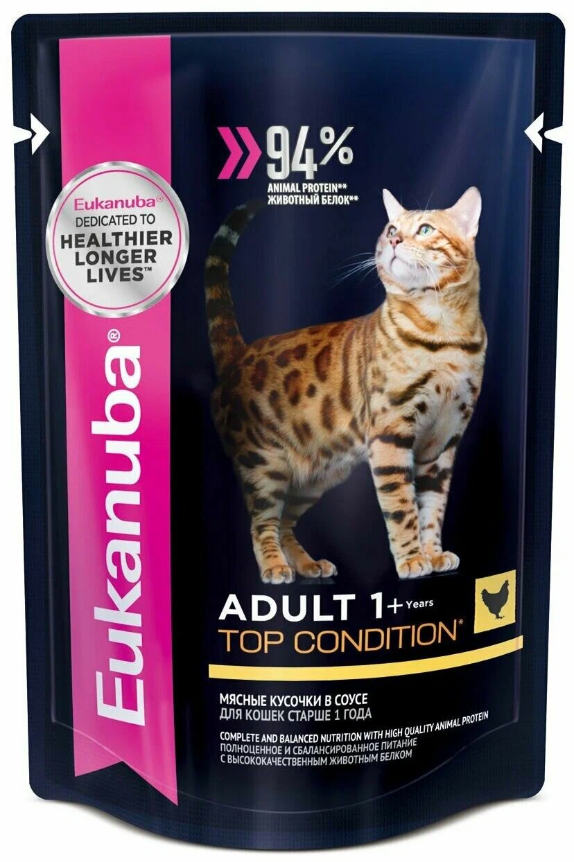 Отзывы на EUKANUBA ADULT TOP CONDITION CHICKEN 85 гр пауч влажный корм для взрослых кошек, курица в соусе 24 шт