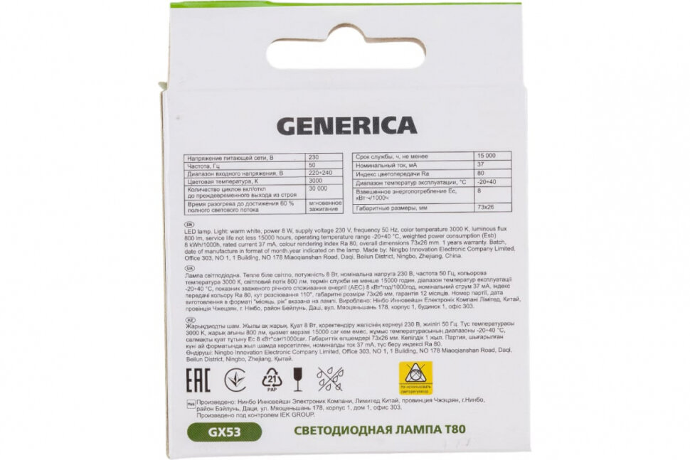Лампа светодиодная T80 8Вт таблетка 3000К GX53 230В GENERICA LL-T80-08-230-30-GX53-G информация: