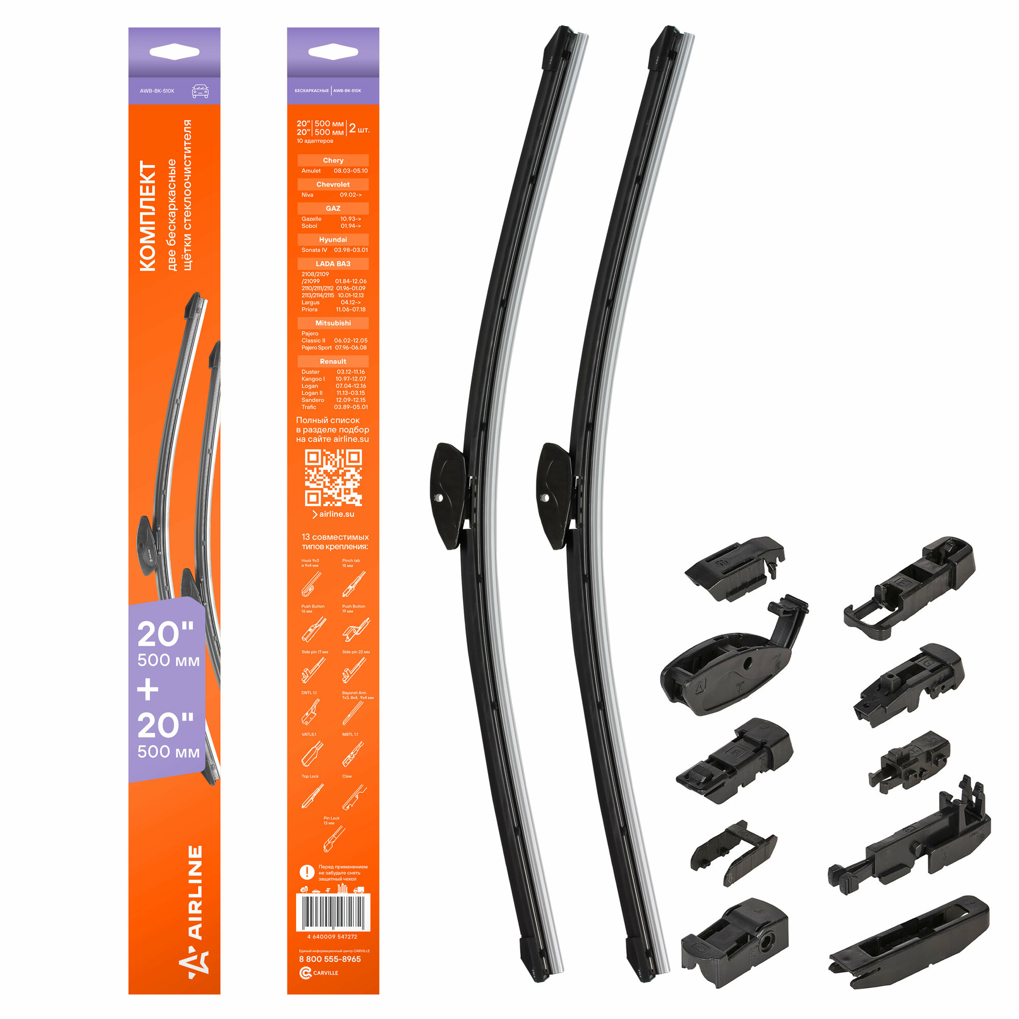 Щетки стеклоочистителя 500/500мм (20"/20") бескаркасные для а/м LADA ВАЗ 2113-15 (01-13), 2110-12 (96-09), Priora (06-18), Chevrolet Niva (02-), Renault Logan (04-16), 2 шт. 10 адптр AWB-BK-510K AIRLINE