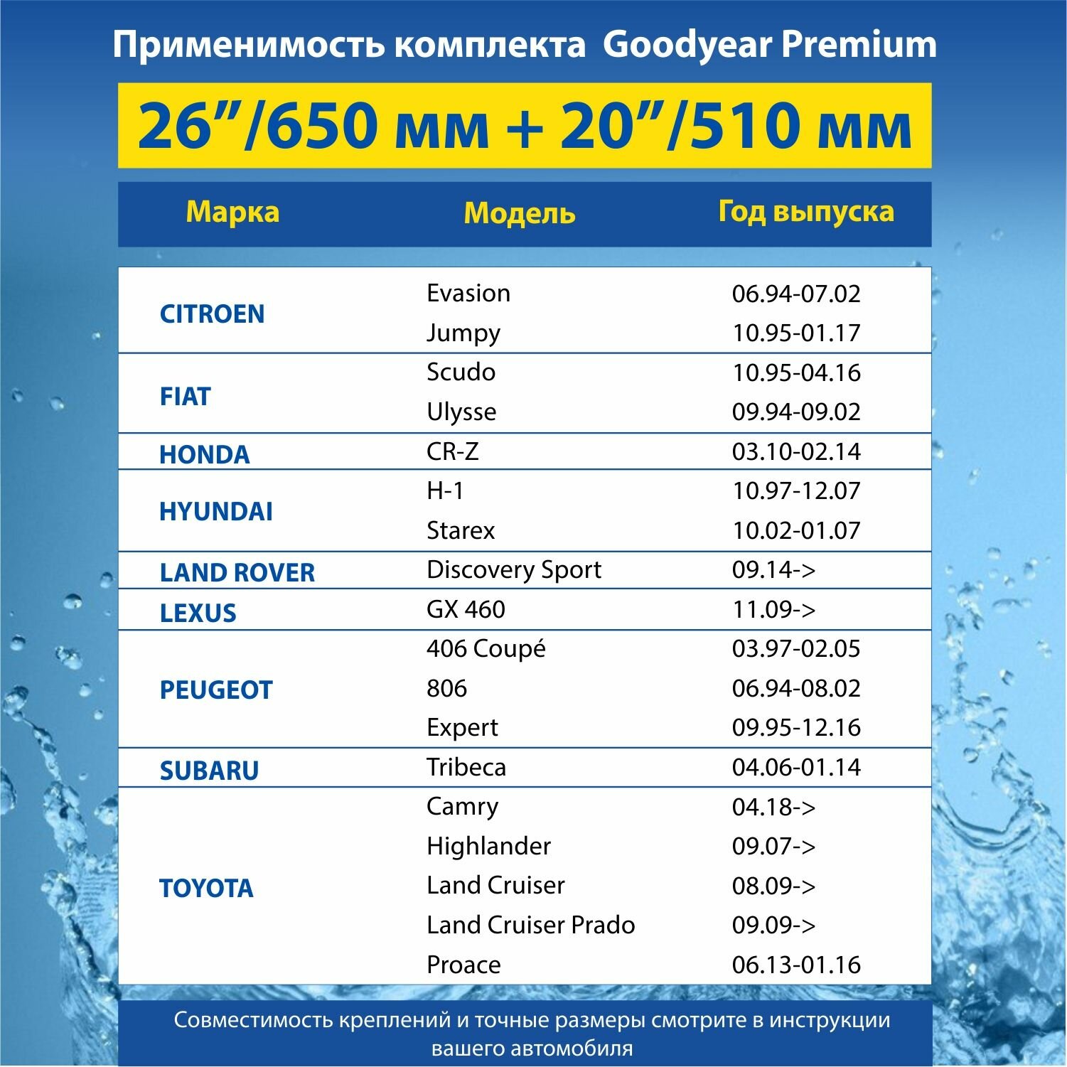Отзывы на 2 Щетки стеклоочистителя в комплекте (65+51 см), Дворники для автомобиля GOODYEAR для TOYOTA Camry 18-Н.В Highlander 07-Н.В. Land Cruiser 09-Н.В.; PEUGEOT Expert 95-16; SUBARU Tribeca 06-14