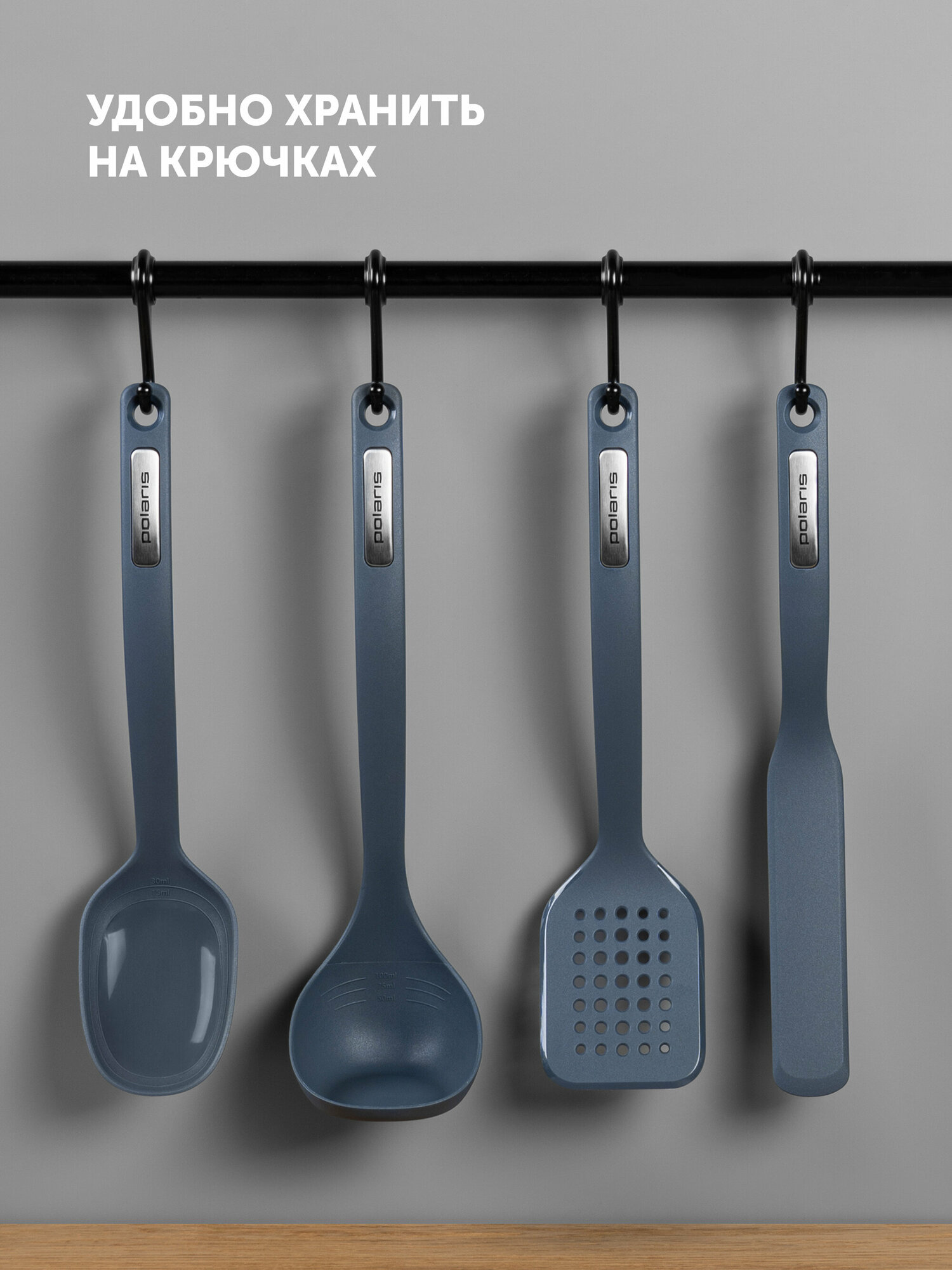 Набор кухонных аксессуаров Polaris "EasyKeep-4N" (лопатка для блинов, лопатка, ложка, половник) 4 предмета графит информация: