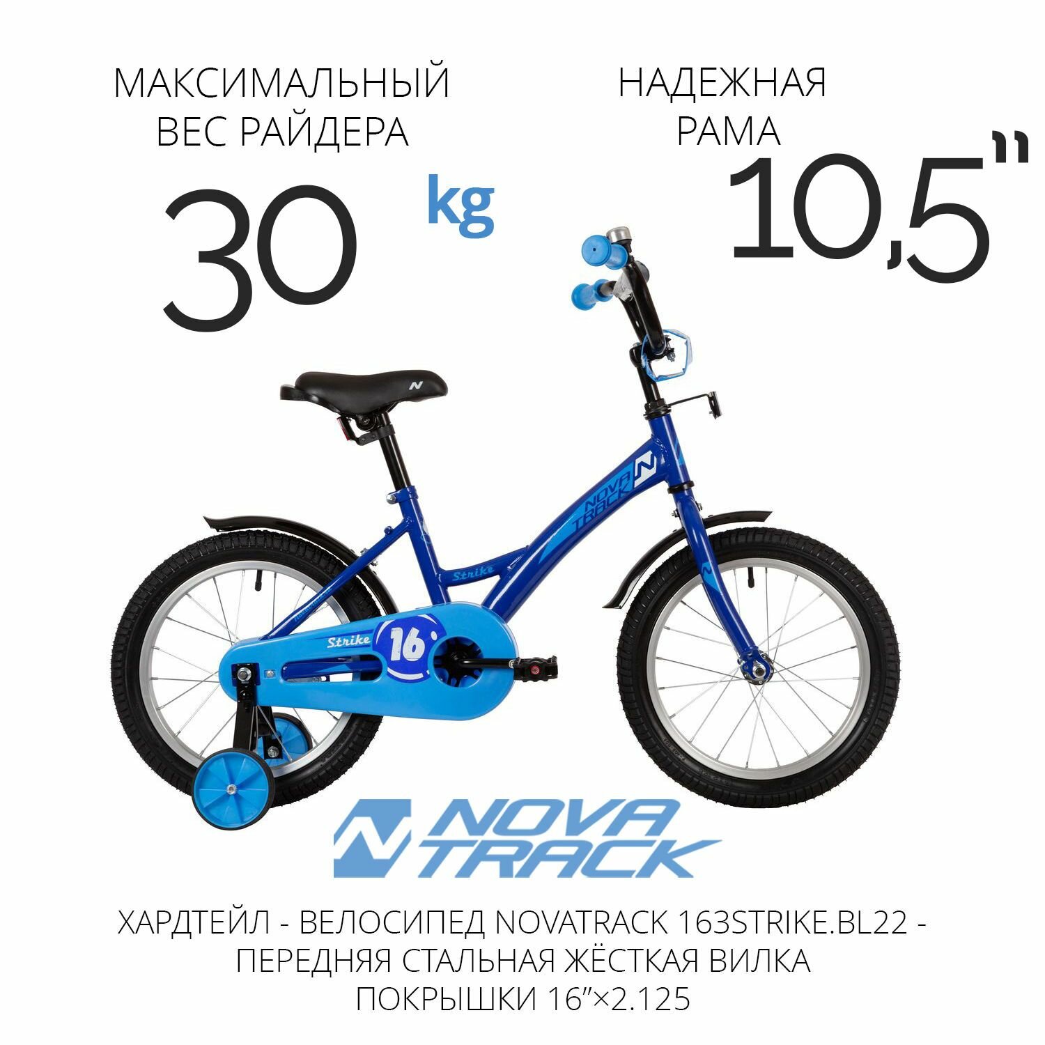 NOVATRACK 163STRIKE.BL22 Велосипед 16 хардтейл Novatrack Strike (2022) количество скоростей 1 рама сталь 10,5 синий