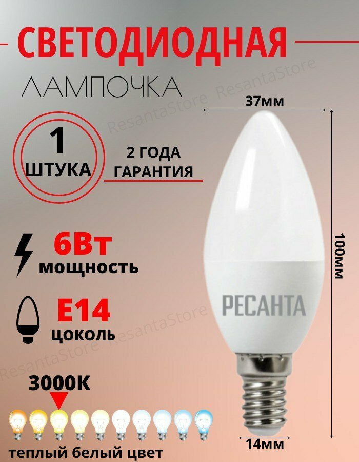 10 цен на Лампа светодиодная 6 Вт белый свет LL-R-C37-6W-230-3K-E14 Ресанта 76/1/3
