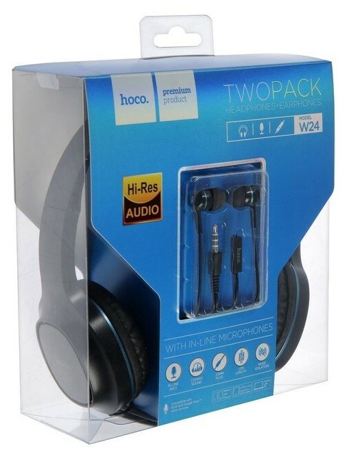 Набор наушники полноразмерные проводные + внутриканальные HOCO W24 Enlighten, микрофон, кабель 1.2 м, цвет синий