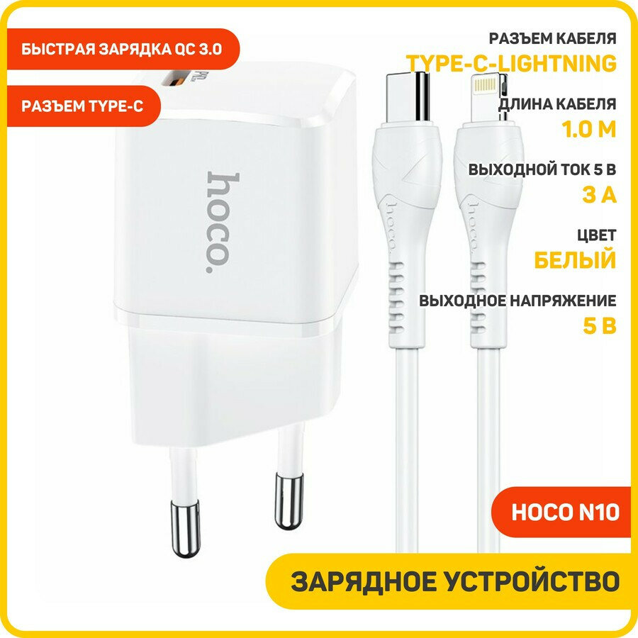 Сетевое зарядное устройство (СЗУ) Hoco N10 (Type-C PD) + кабель Type-C-Lightning, 3 А, белый