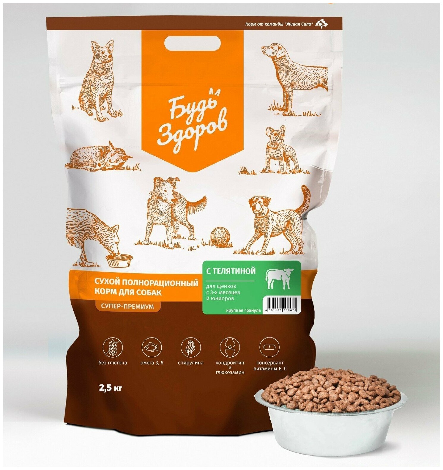 Будь здоров Сухой полнорационный корм для щенков с 3-х месяцев и юниоров, с телятиной, 2,5 кг, крупная гранула