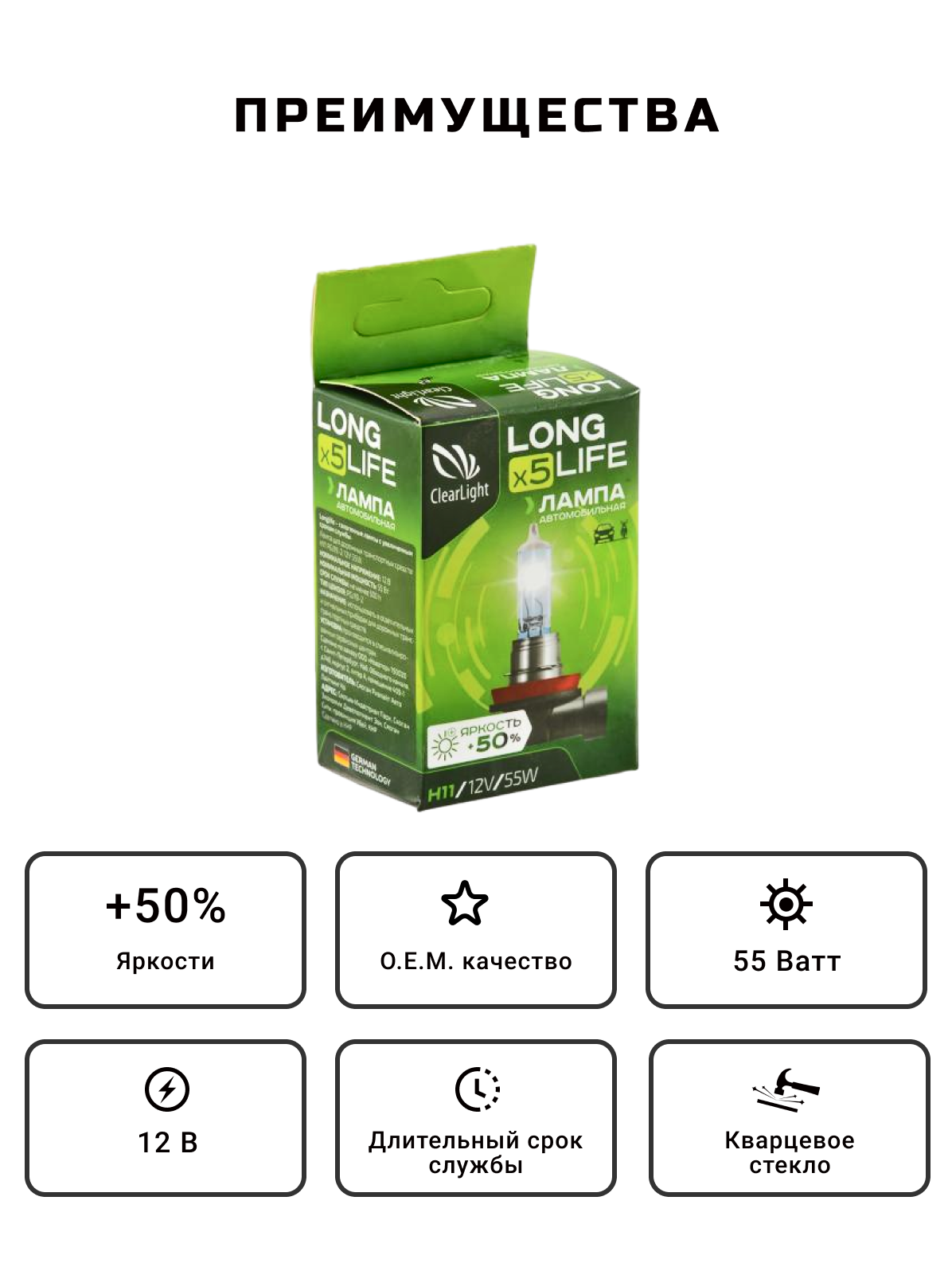 Галогеновая лампочка Clearlight LongLife H11 3200K 12V-55W информация: