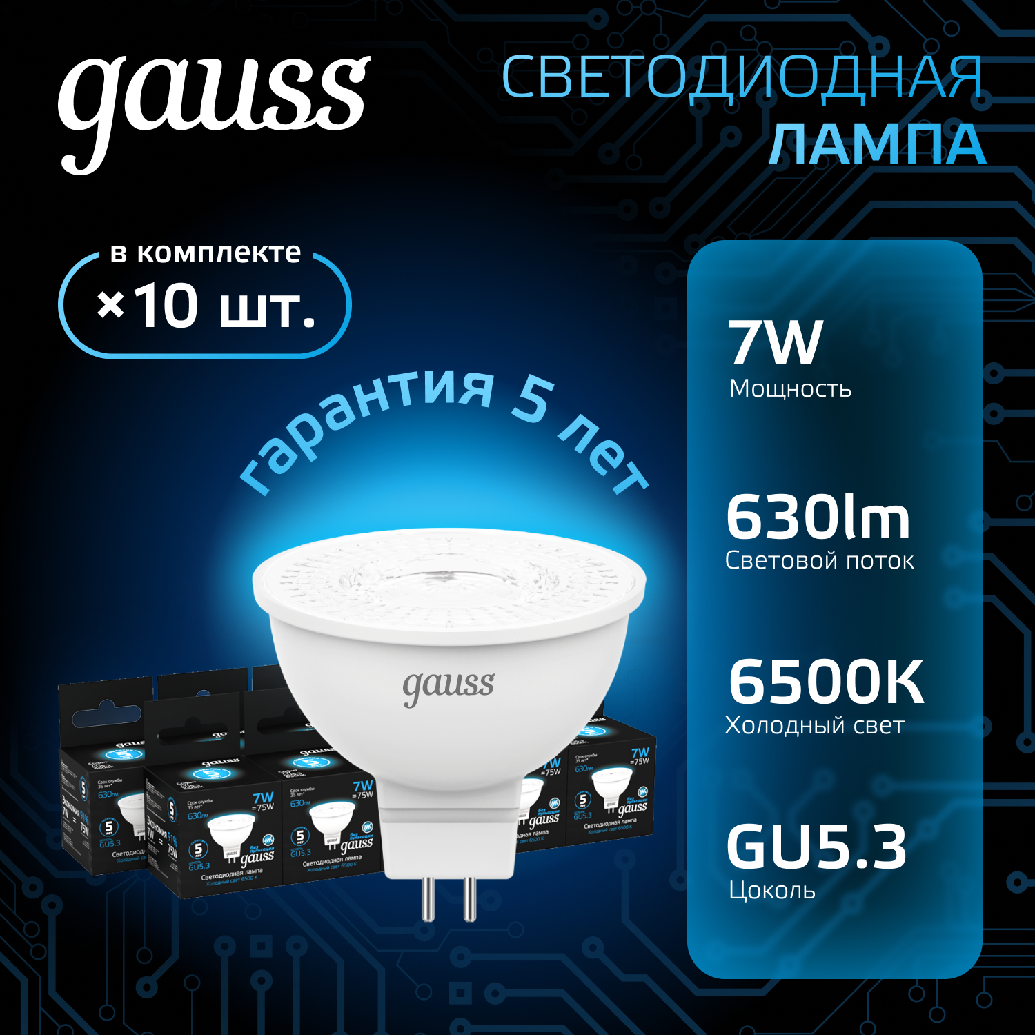 Упаковка светодиодных ламп 10 шт. gauss 101505307, GU5.3, MR16, 7 Вт, 6500 К