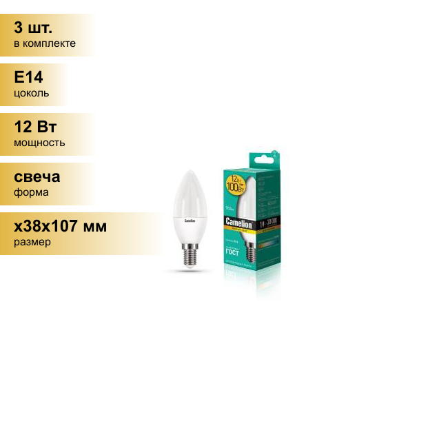 (3 шт.) Светодиодная лампочка Camelion Свеча E14 12W(960lm 220°) 3000K 2K матов. 107x38 пластик LED12-C35/830/E14 . Цоколь E14 информация: