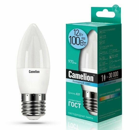 Отзывы на (5 шт.) Светодиодная лампочка Camelion Свеча E27 12W(970lm 220°) 4500K 4K матов. 107x38 пластик LED12-C35/845/E27 . Цоколь E27