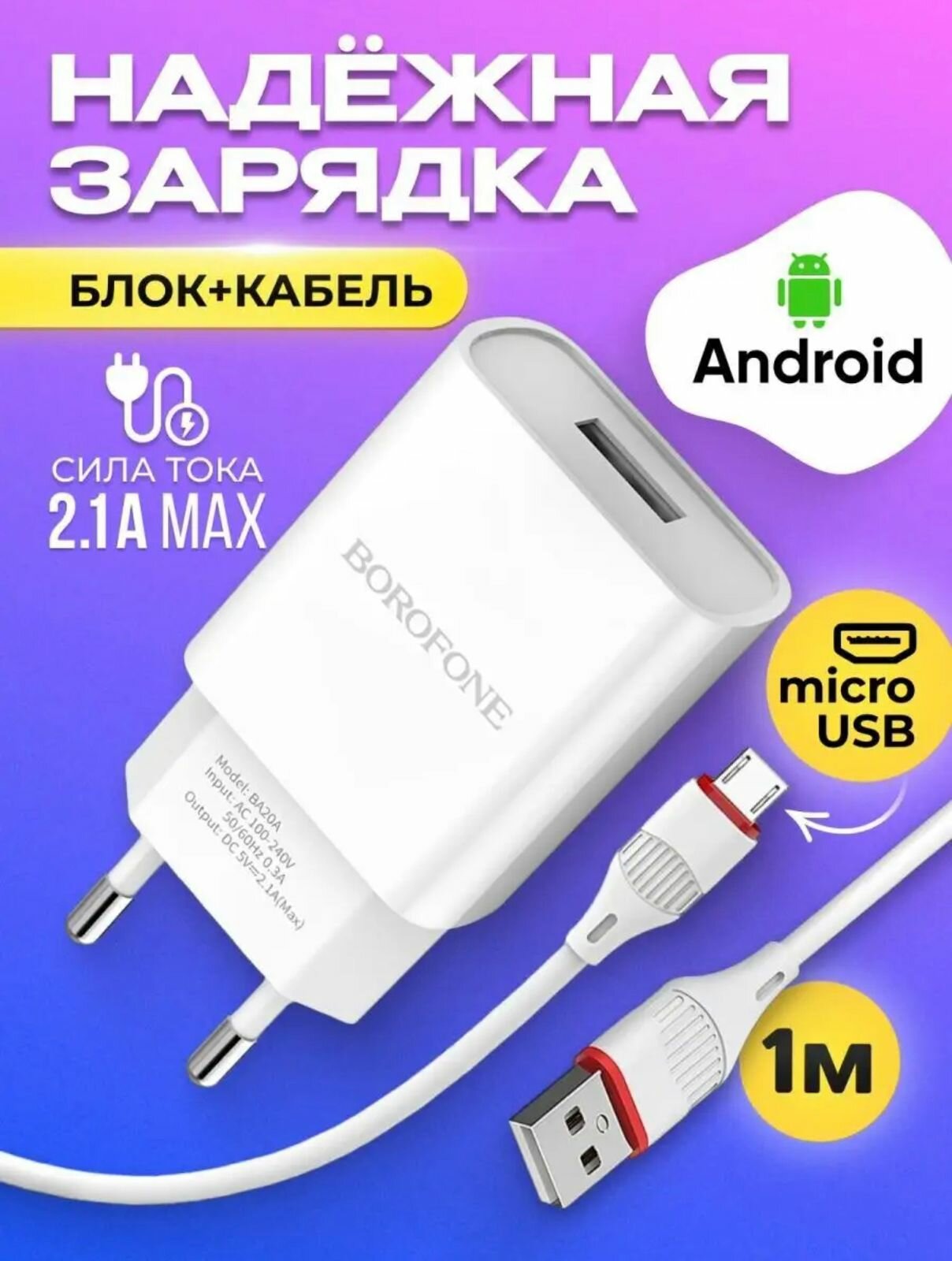 Быстрая зарядка для телефона с кабелем Micro-USB в комплекте / для смартфонов Android / сетевое зарядное устройство / адаптер питания / BOROFONE BA20A