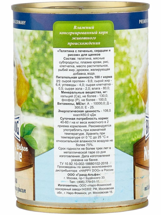 Корм HAPPY DOG для щенков, телятина с печенью, сердцем и рисом Natur Line 410гр информация: