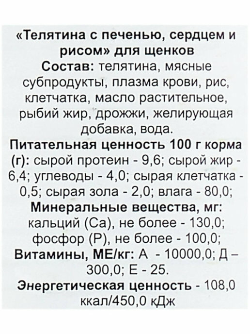 | Состав | Телятина, говядина, мясные продукты говядины – сердце, печень, рубец, рис, растительное масло, витаминно-минеральный комплекс. |
