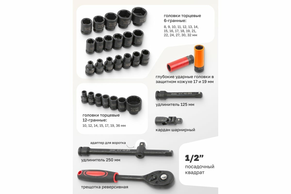 Набор инструментов ударных 32пр.1/2''(6гр.)(10-32мм, Cr-Mo) Rock FORCE RF-4323-5MPB информация: