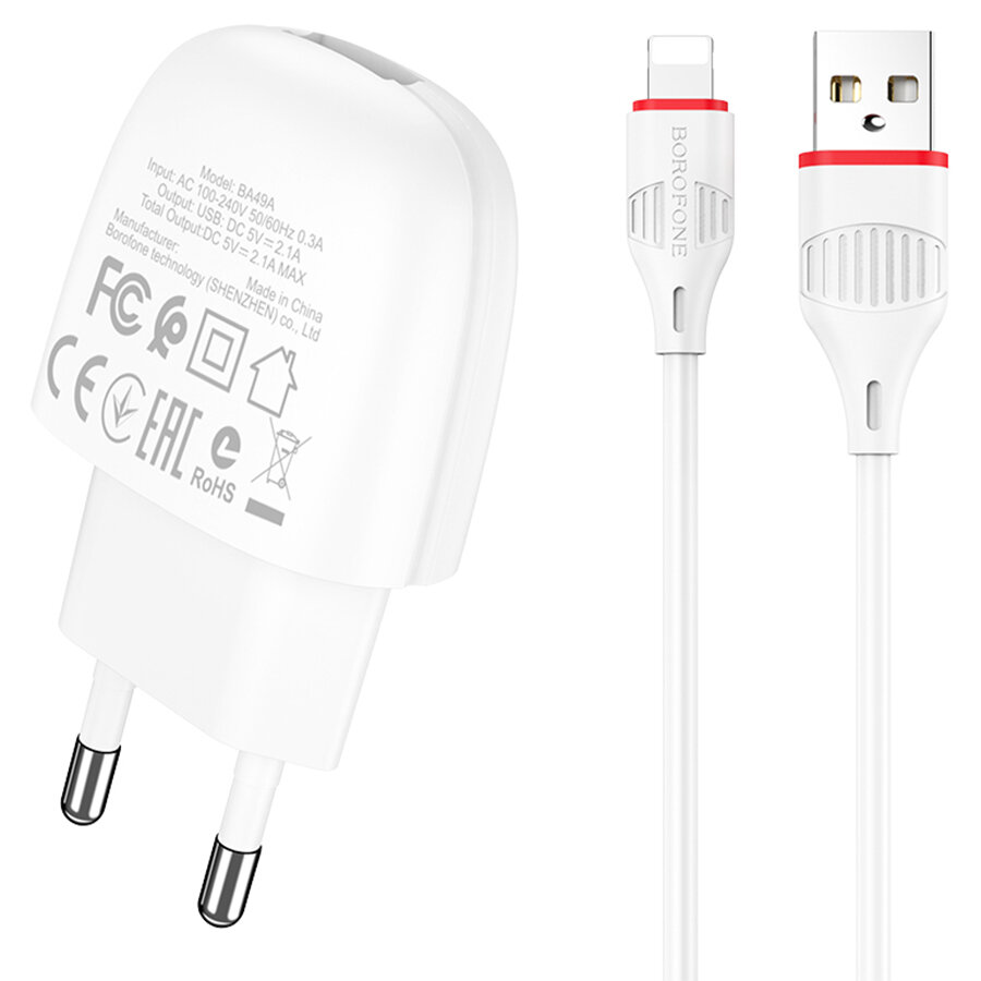 Сетевое зарядное устройство Borofone Ba49a, Usb, 2.1 А, кабель Lightning, белое Borofone 9088837