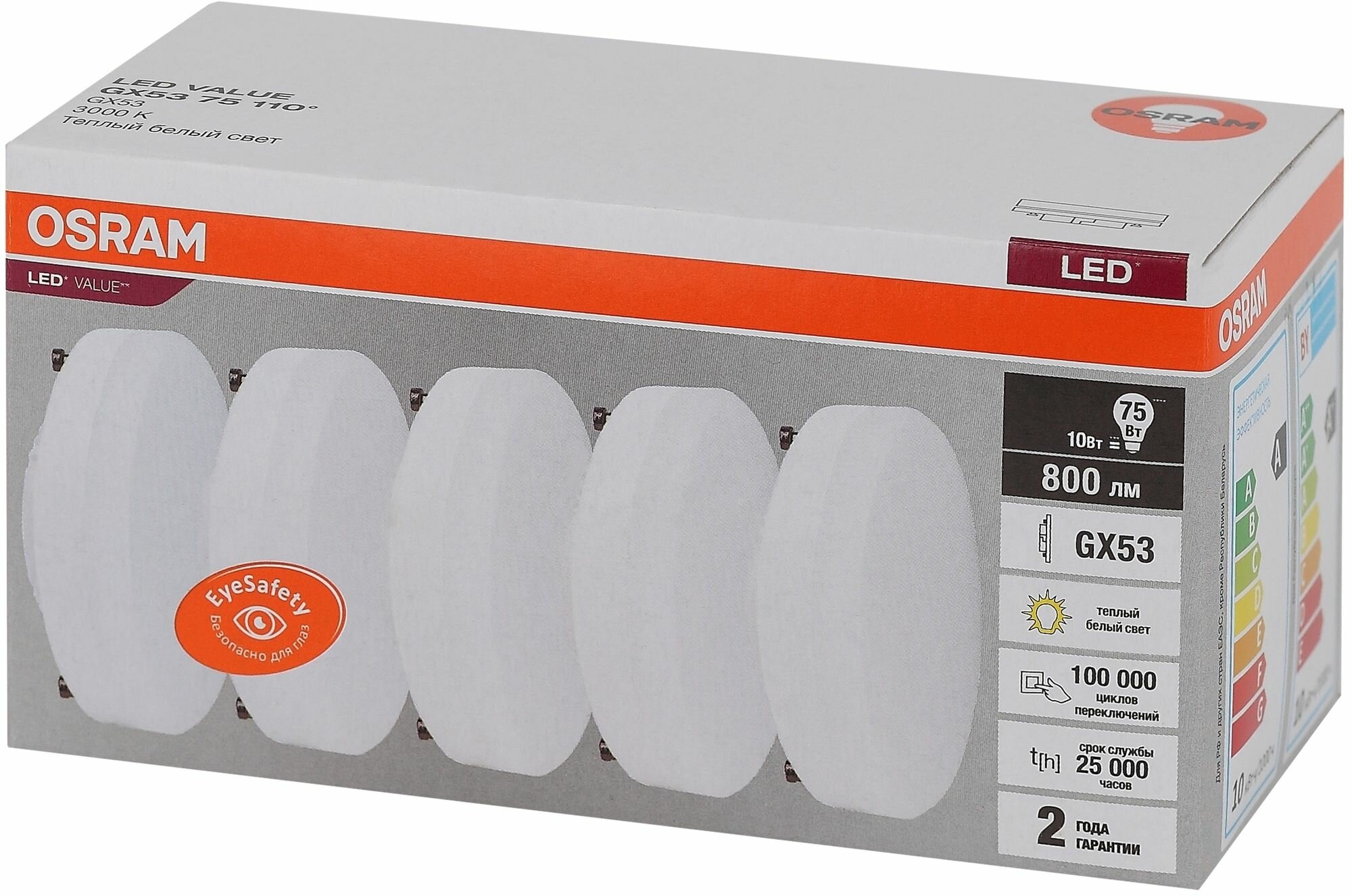 Лампа светодиодная OSRAM LED Value GX53, 800лм, 10Вт, 3000К теплый свет, GX53, комплект 5 шт
