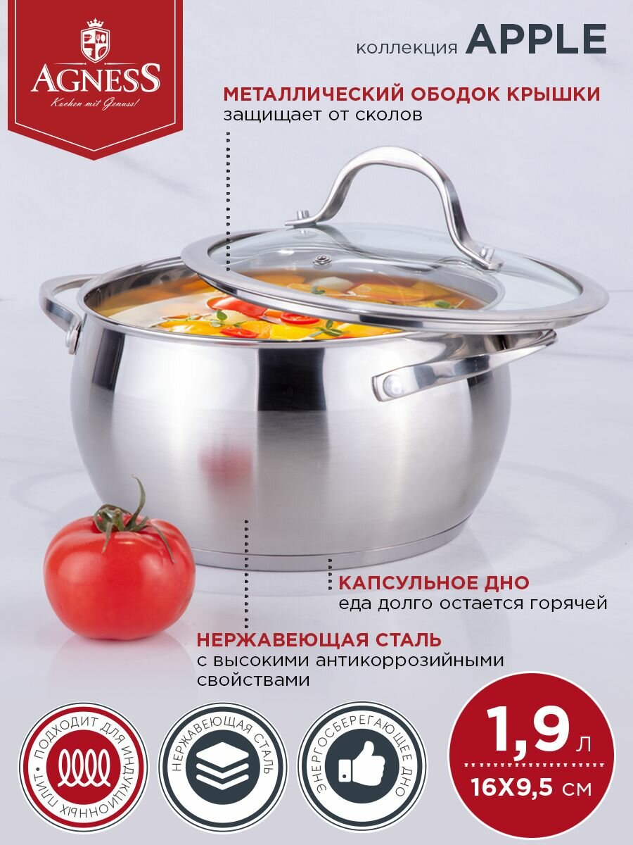 Кастрюля 1,9 литров Agness "Apple" из нержавеющей стали для всех видов плит 16 х 9,5 см информация: