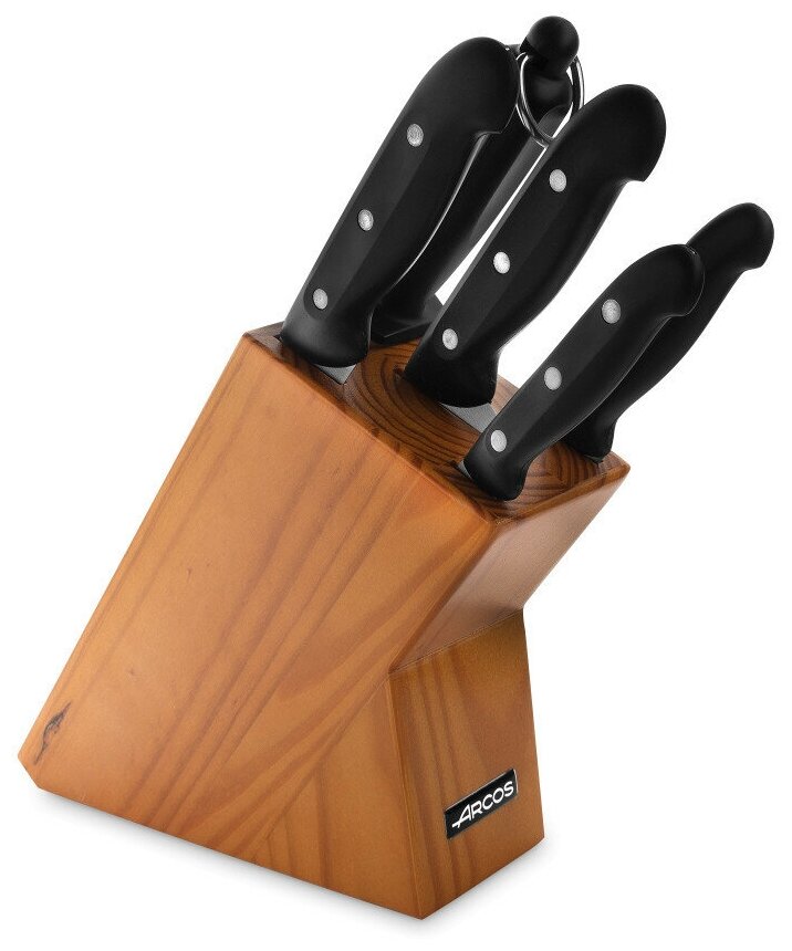 Отзывы на Набор из 4-х кухонных ножей из прокатной высокоуглеродистой нержавеющей стали и мусата в деревянной подставке, пластиковая рукоять, черный, серия Maitre, Arcos, 1520