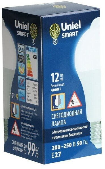 Лампа светодиодная с датчиком освещенности и датчиком движения Uniel LED-A60-12W-4000K-E27-PS+MS, UL-00005713 информация: